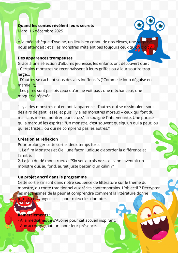 Le mardi 17 décembre nous sommes allés à la Médiathèque d’ Avoine en car. Karine, la bibliothécaire, nous a fait visiter le bâtiment. Ensuite, nous avons cherché des livres sur le thème de la Mythologie. Et puis elle nous a lu une histoire sur Ulysse. Nous avons tous aimé la sortie.